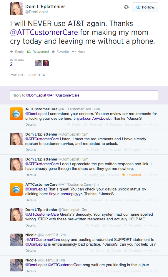 There’s few things that grind my gears more than what you’re going to see below. As an ex-community manager and content producer – seeing these sorts of threads literally makes me want to slap every ^community manager listed below and on the internet everywhere across the face for letting their standards go so low as to use copy and paste support messaging. I can’t. At the end of last week I saw that a girl I follow on Twitter was complaining to @ATT that her experience with their service was terrible… Keep in mind, I’m not even a customer – I’m an innocent bystander, just observing their shitty brand practices.