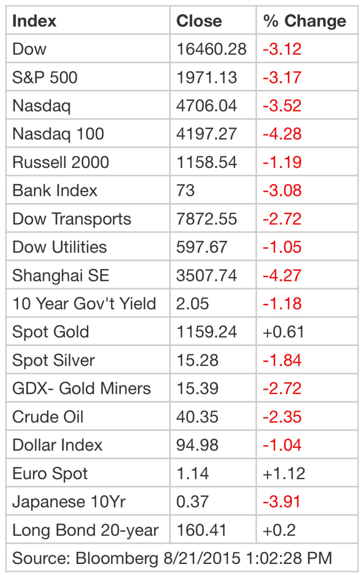 Note: This post is originally from FleckensteinCapital.com, posted on August 21, 2015. My dad is in the investment business and has a subscription site where he comments on market action and has an active community and conversation built around “#AskFleck,” his Q&A that I edit daily. He asked that I post this piece from Friday here so as to make his insights available because he wants people to hear “the facts and not the Bubblvision hype.” (Bubblevision is CNBC.)