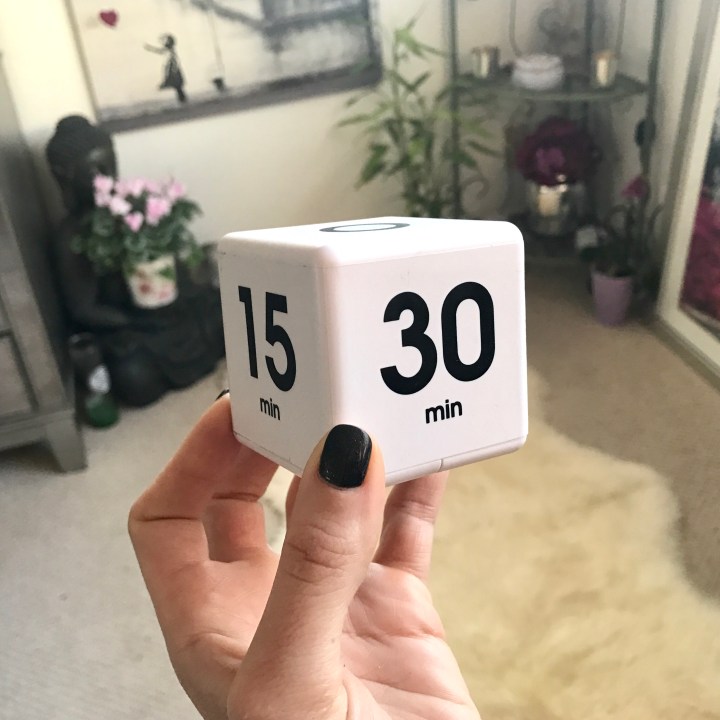 It’s literally… a cube with a timer… It has 4 options to set: 5 min, 15 min, 30 min, 60 min. You place it on whichever side of time you want to give yourself, and it starts. You can see how much time is left as it counts down on one side, though I usually keep it out of sight so I’m not thinking about how much time I have left.